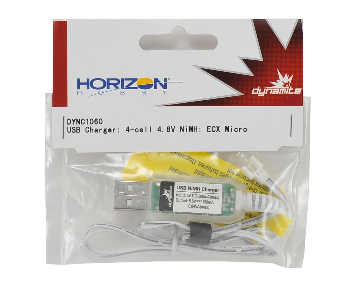 Dynamite 4-cell 4.8V NiMH USB Charger. This is the replacement charger for the ECX Ruckus and Torment 1/24 scale trucks.Â