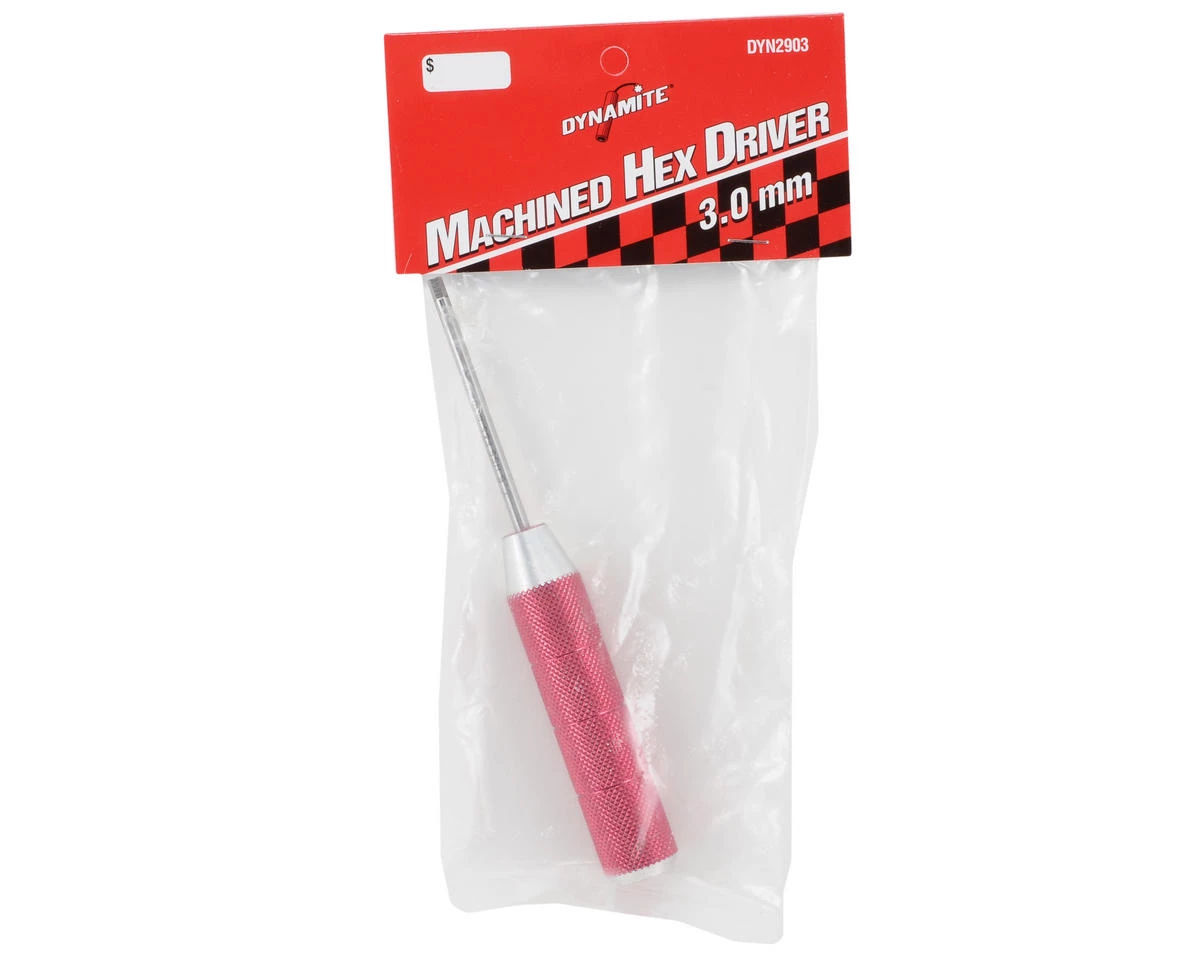 This is a Dynamite 3.0mm Machined Aluminum Handle Hex Driver. These hardened steel-tipped tools will last a long time. Their comfortable-grip red anodized handles are flat on one side so they won’t roll off the workbench. Replacement tips are available in all sizes.