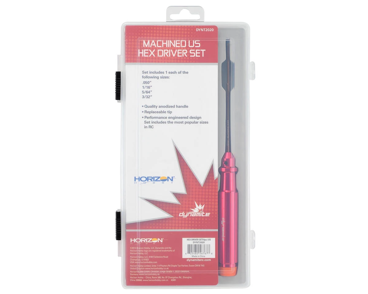 This is a Dynamite Machined Standard Hex Driver Set. Dynamite tools feature stylish red anodized aluminum handles, with replaceable steel tips. To make wrenching easier on your hands, the handles include rotating plastic end caps to swivel in your palm. Plus, the end caps have the tool size printed on the end, and are color coded for easy identification. Package includes .050″, 1/16″, 5/64″ and 3/32″ size hex wrenches.