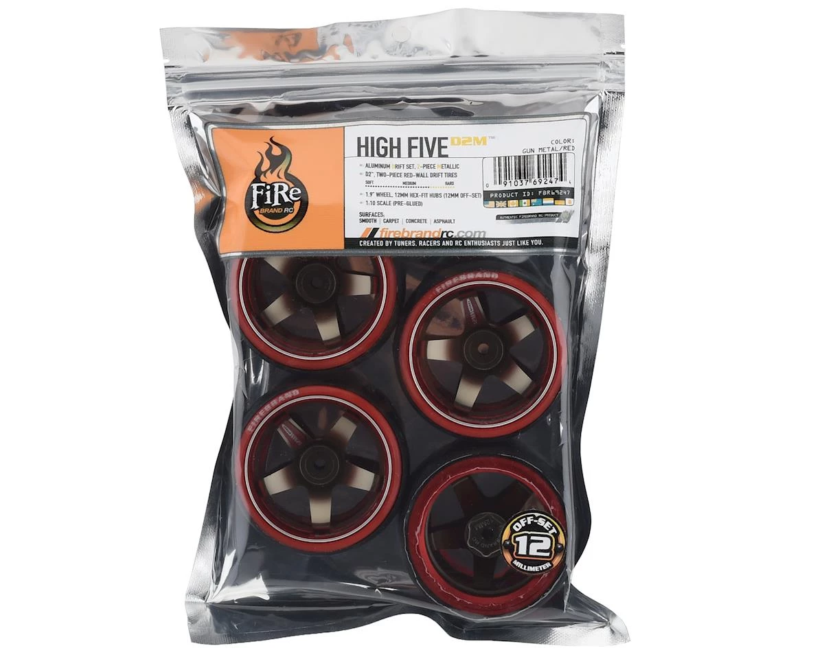 Firebrand Highfive D2M12 Pre-Mounted Slick Drift Tires feature an exclusive, top of the line aluminum wheel. It doesn’t get much cooler than this. The aluminum wheels are wrapped with 2-piece, D2 drift tires. Weighing in at a whopping 1.9 ounces each – you’ll enjoy a whole new on-road experience. With a 12mm hub off-set, you’ll lower your car’s center of gravity and experience a smoother and more controlled drift set-up. Package includes four tires pre-mounted on aluminum wheels.