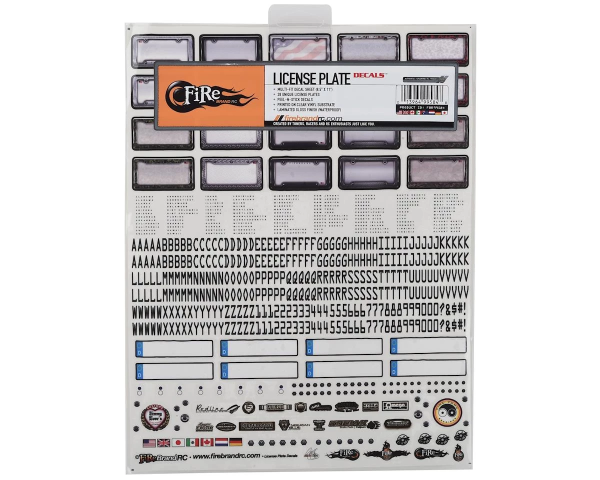 Firebrand Customizable License Plate Decals let you personalize ALL of your scale projects! Multiple letter sets allow you to create any name or number you like. Includes 20 American style plates and 8 Euro style plates. Add even more realism with the included state name, sponsor and nut/bolt decals. These laminated decals are die-cut for easy, “peel-n-stick” application.