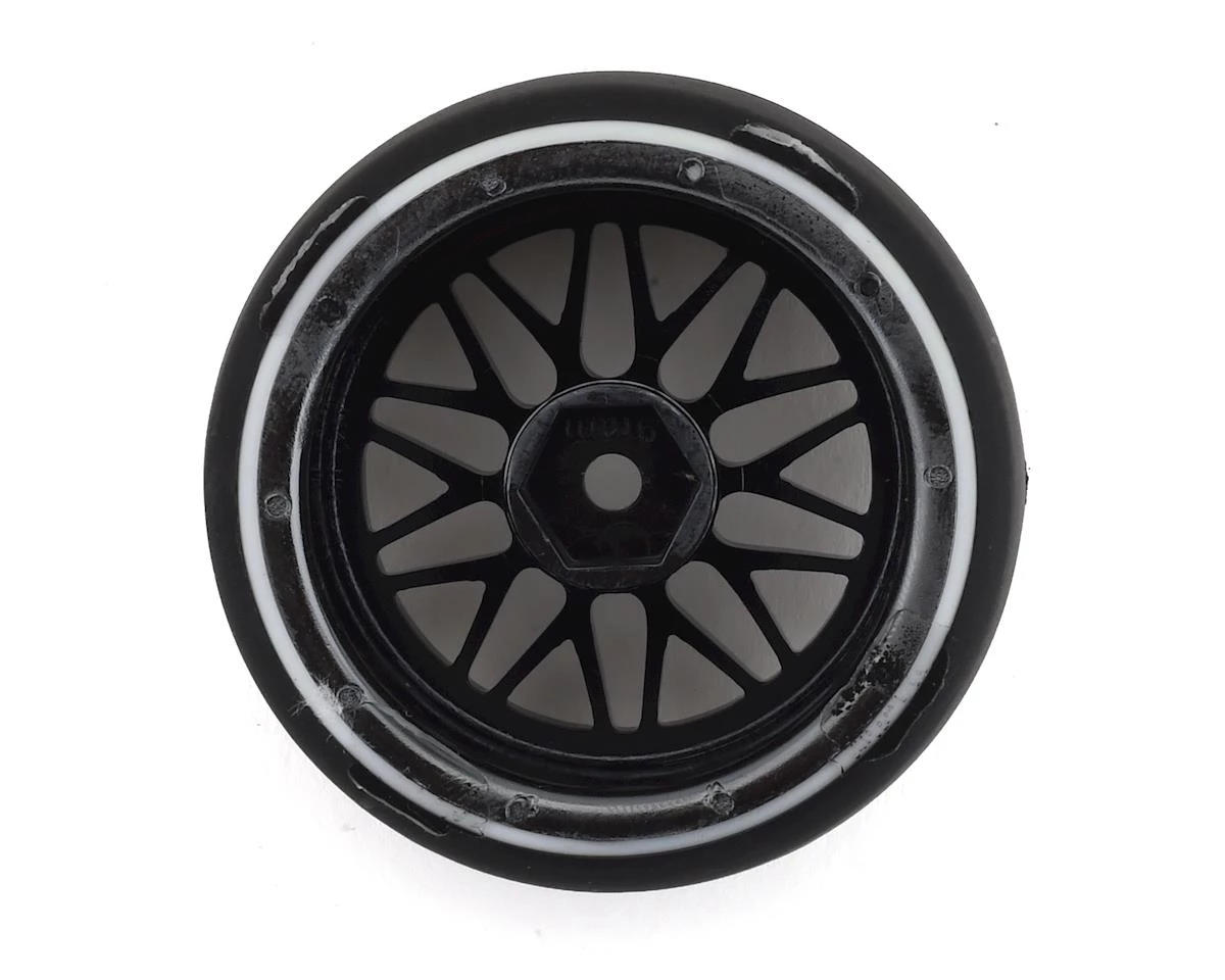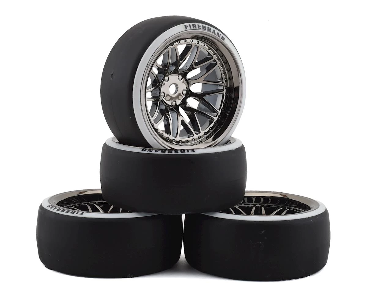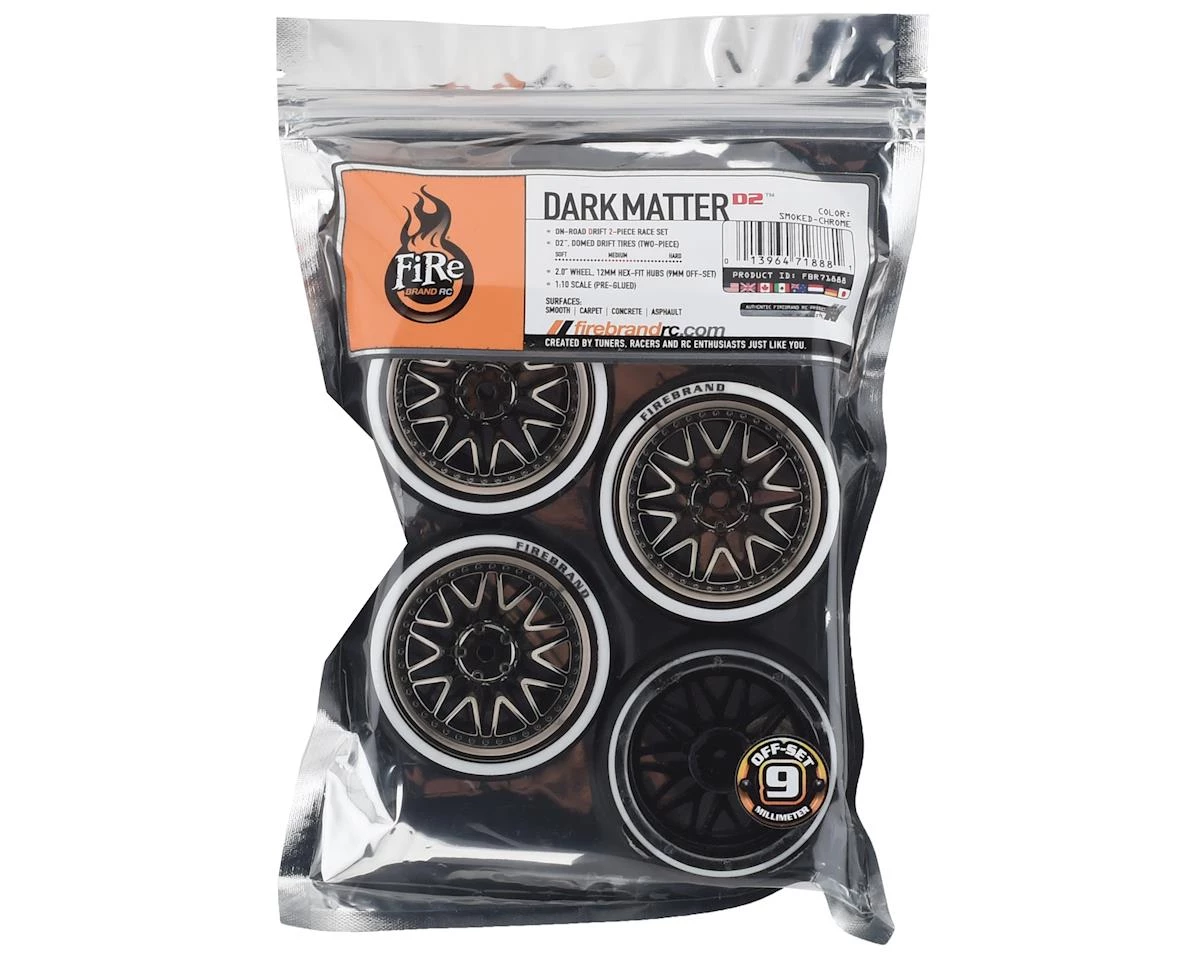 Firebrand Darkmatter D29 Pre-Mounted 2-Piece Drift Tires feature DarkMatter-D2(9) on-road drift wheels mounted to D2 2-piece drift tires. Both are made from the highest quality ABS plastic and rubber materials available. The D2 tires are a super low-profile, low-traction, 2-piece, white-wall drift tire option. These drift wheels and tires fit most 1:10 scale, on-road, radio-controlled cars. DarkMatter drift wheels are available in Smoker’s Chrome and, if desired, can be painted with poly carbonate paint. 12mm, hex-fit hubs w/9mm off-set.
