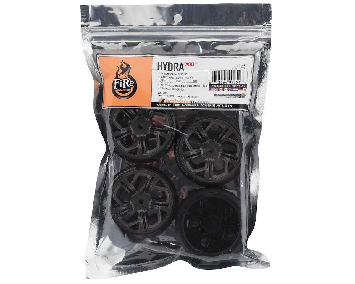 Firebrand Hydra XD3 0° Pre-Mounted Slick Drift Tires feature the Hydra-XD on-road drift wheel. The wheels are fitted with Blades – a super low-profile, low-traction, 45°/0° beveled drift tire. These are made from the highest quality ABS plastic and rubber materials available. These drift wheels and tires fit most 1:10 scale, on-road, radio-controlled cars. The 2.0″ x 1.0″ Hydra drift wheels are available in metallic Uzi-Metal color and, if desired, can be painted with poly carbonate paint.